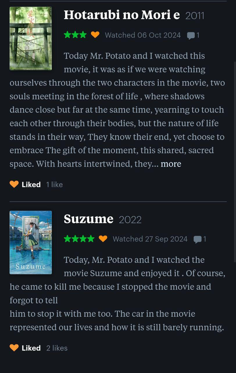 افلام مستحيل تنسي , كمية مشاعر الي عشناها سوه هنا , متتقدر ومن شفنا "سوزومي" قبل سفرتي ولا من شفنا فلم ثاني هذا قصير قبل امتحانك بس كانت لحظات ثمينة جدا, وفلم اخر الي بقينا بس محجي ونضحك بيه بالاتصال HaHa , وفكرتك انو نكتب رأينا عن فلم و لحظات الي عشناها عظيمة
