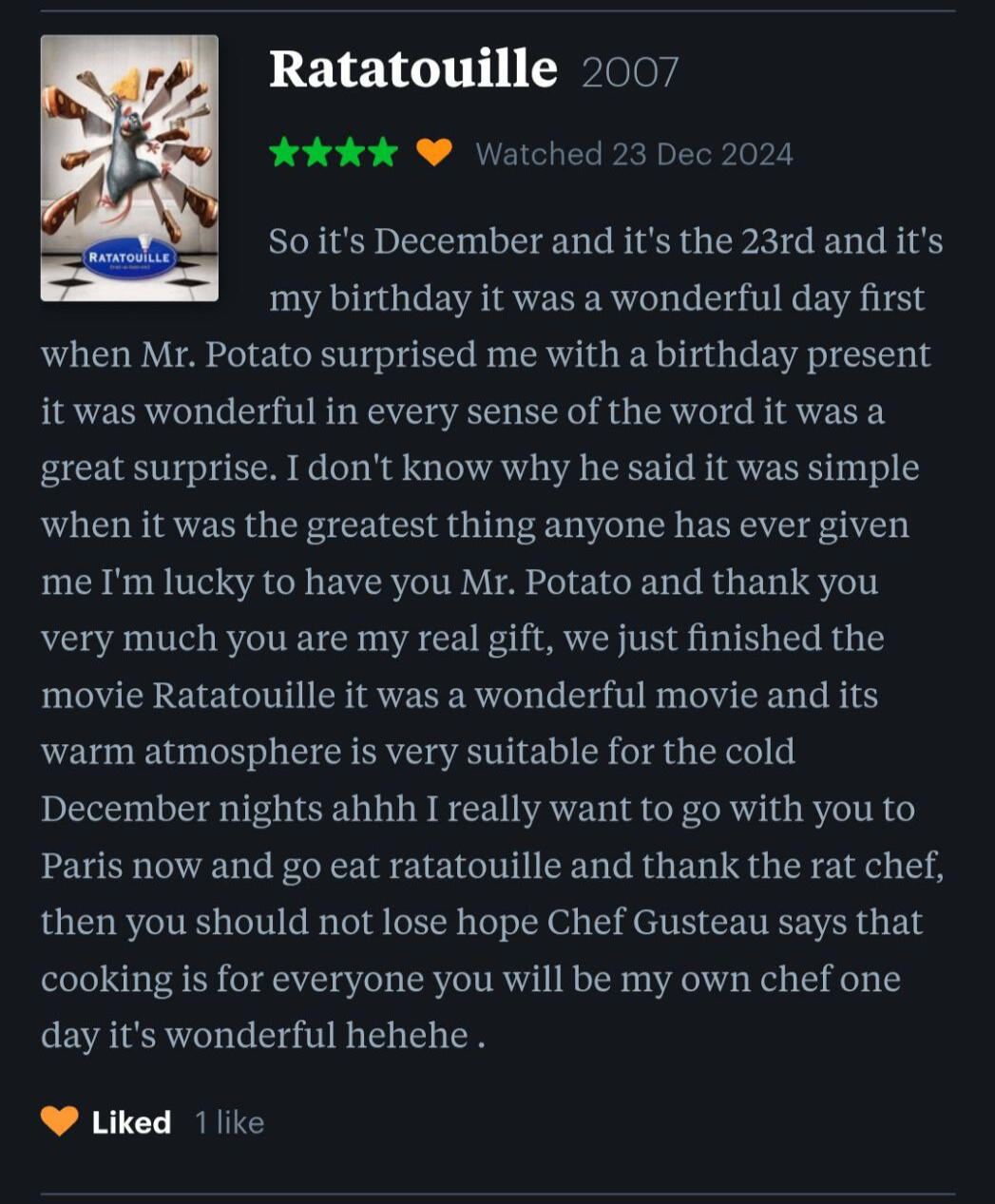 To: My dear and one of the most wonderful, lovely people I’ve met, Mariah (aka my eggplant),HAPPPPPPPY BIRTHDAY, my eggplant!Today is one of the BEST days ever because, you know what? Someone called Mariah was born on this day, the 23rd of December. She’s a lovely girl with a pure soul, a kind heart, and incredible strength. She doesn’t give up, even when life throws challenges her way.Mariah has amazing taste—she always picks the best things. Her taste in music and songs? Absolutely awesome, and I like it a lot. But it’s not just that. Her way of thinking is so special—mature yet alive. Not many people are like her, and I’m so glad I got the chance to meet her and get to know her better. to witness your beauty from the inside and outsideAnd, of course, she’s soooo pretty! Her eyes are gorgeous and deep, her face is charming and appealing, and her hair is absolutely enchanting. Her cute nose adds to her beautiful face. She’s not just charming—she’s hot (haha)! Please stay the same and continue to light up the world every year.I wish you the best in every moment—both in the past we can’t change and in the unknown future ahead. I’m sure you’ll become a successful person and an amazing woman because you already have such a warmhearted and wonderful way of thinking.Don’t stay sad or upset for too long. Everything is temporary, but not you. The challenges you face will become chapters you’ll share with your loved ones in the future. Remember, anyone who talks bad about you doesn’t define your worth because you are perfect. ans if you think you have negative things or sometimes you don't like things about yourself than know that someone else will love , takes care, and like everything about you, so don't worry and don't think a lot ,A potato (me) always reminds you that you are a lovely eggplant. So keep trying, keep shining like the moon at midnight and the sunshine in the morning.ALWAYS TAKE CARE OF YOURSELF AND BE CAREFUL, CHOOSE THE RIGHT PEOPLE, BE SAFE